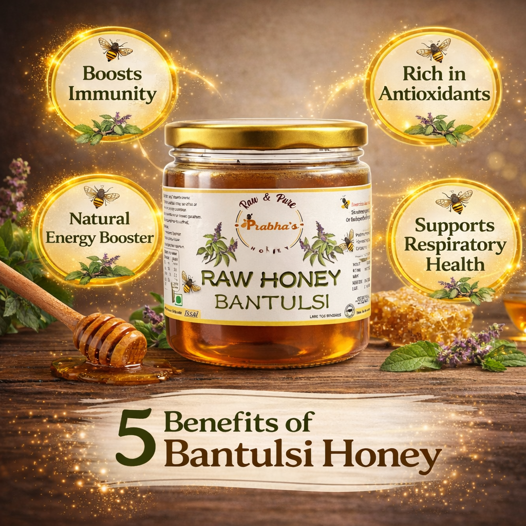 Tulsi Honey is prepared by infusing Krishna Tulsi Rama Tulsi and Vana Tulsi along with ashwagandha and honey. Tulsi is one of the oldest herbs and besides using it for spiritual reasons it also has healing properties. Tulsi is known as the ‘Holy Basil’ and considered sacred among Hindus. Tulsi contain immune modulatory compounds that not only boost your immunity. The antitussive properties act on the nerves that trigger cough, thereby preventing you from coughing. Tulsi honey is extremely medicinal and contains anti-inflammatory properties. It treats cough, cold, and respiratory infections. Tulsi honey gives a soothing effect when you have a cold, cough and fever. It is also an energy booster and a natural remedy for many ailments. Tulsi honey can also ease your stress levels and relax you. It helps in managing anxiety as well.